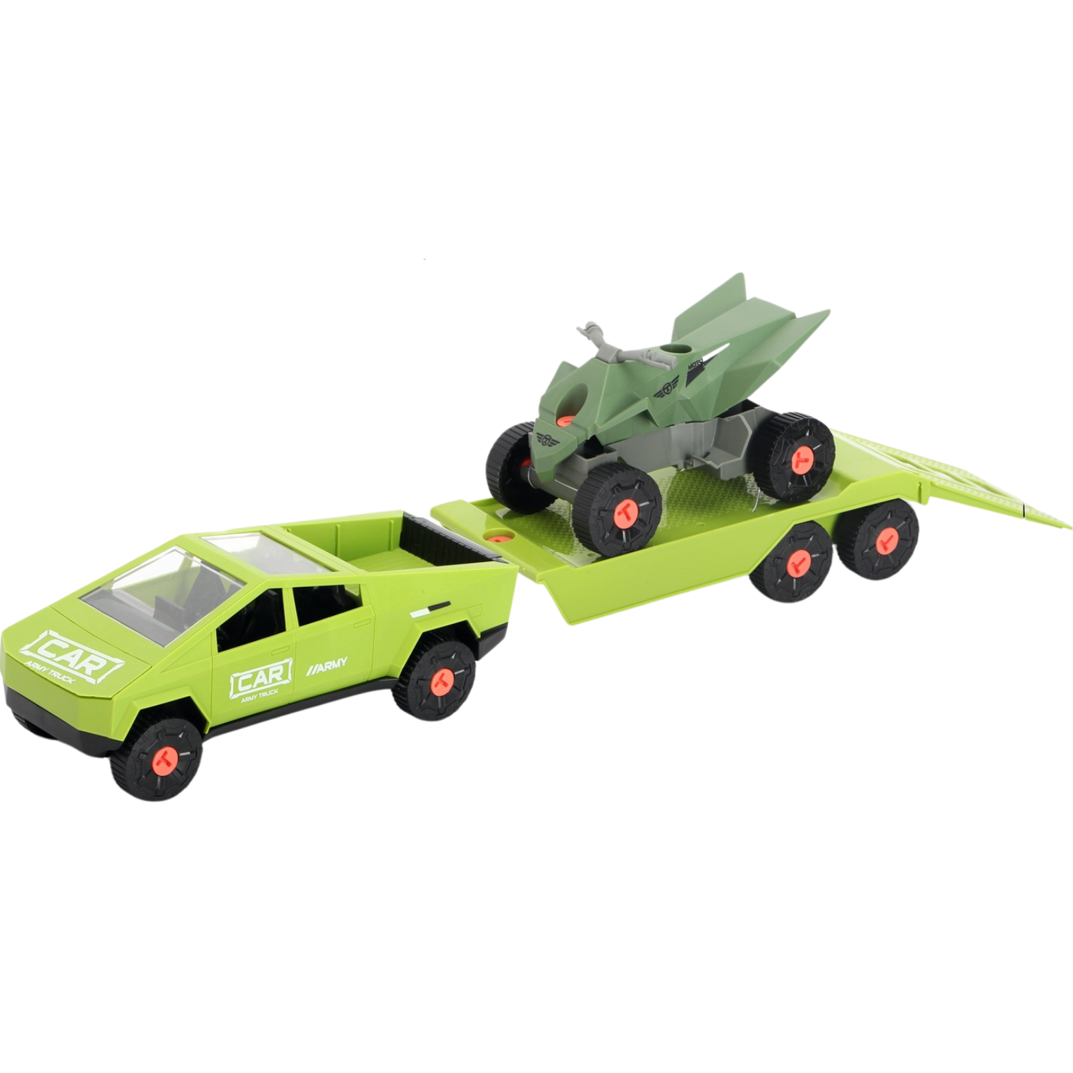Samochód z przesuwaną przyczepą to główny element zestawu. Wyposażony w ruchome części, samochód oferuje pełen zakres zabawy. Koła pojazdu można samodzielnie wkręcać i wykręcać, co rozwija zdolności motoryczne dziecka. Przyczepa zawiera quad oraz czołg, które również posiadają elementy do montażu i demontażu.
