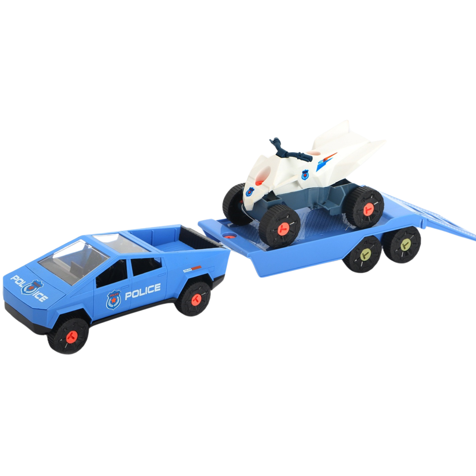 Samochód z przesuwaną przyczepą to główny element zestawu. Wyposażony w ruchome części, samochód oferuje pełen zakres zabawy. Koła pojazdu można samodzielnie wkręcać i wykręcać, co rozwija zdolności motoryczne dziecka. Przyczepa zawiera quad gotowy do jazdy! Elementy quadu również można wkręcać i wykręcać według uznania.
