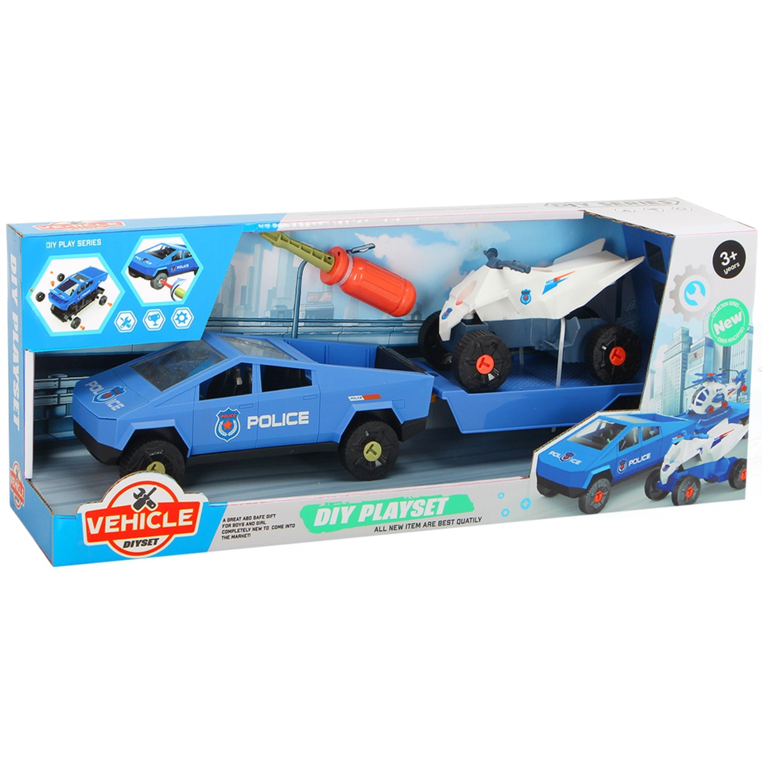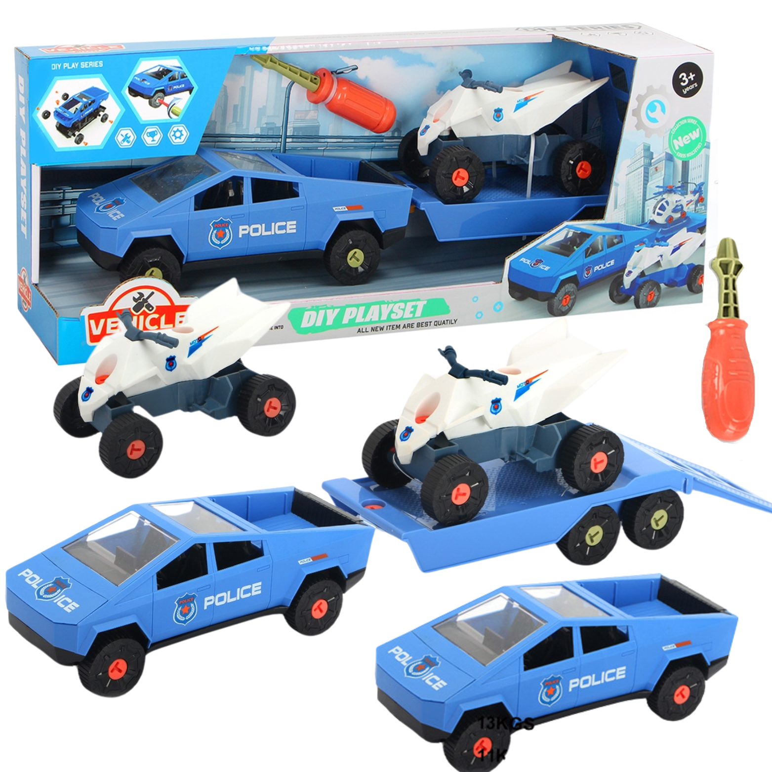 ZESTAW SAMOCHÓD DO MONTAŻU Z PRZYCZEPĄ QUAD ŚRUBOKRĘT WÓZ POLICYJNY