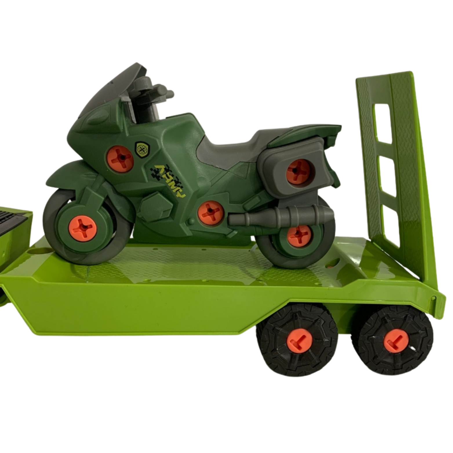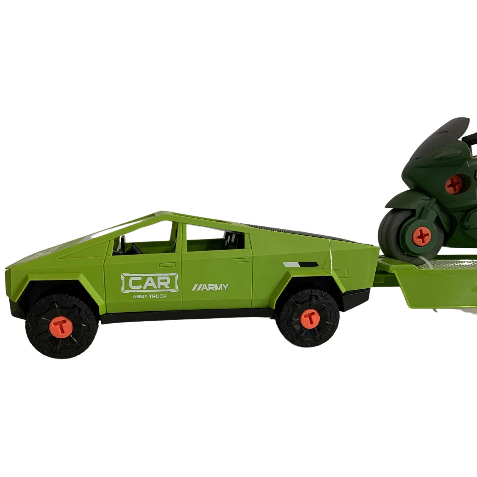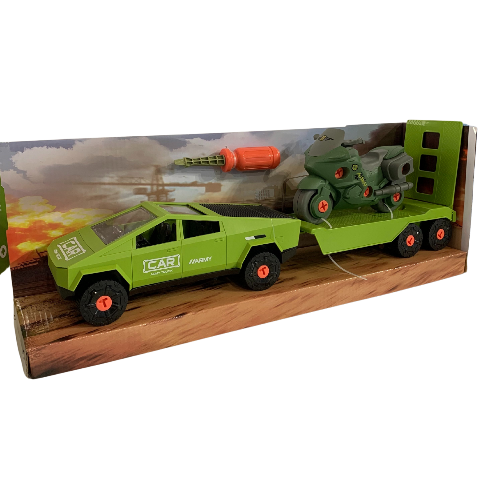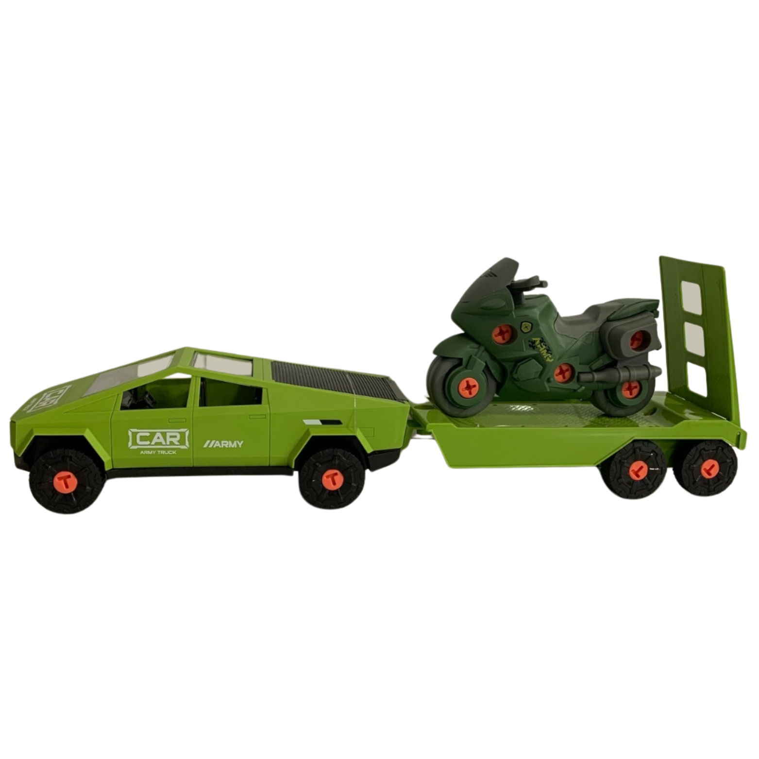 Samochód z przesuwaną przyczepą to główny element zestawu. Wyposażony w ruchome części, samochód oferuje pełen zakres zabawy. Koła pojazdu można samodzielnie wkręcać i wykręcać, co rozwija zdolności motoryczne dziecka. Przyczepa zawiera motor gotowy do startu! Elementy motora również można montować samodzielnie.